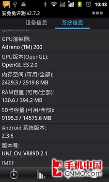 在系统信息中我们看到中兴V889D的主屏为1GHz,不过并没有确切的型号信息。通过CPU型号ARMv7 Processor,以及GPU型号Adreno 205,我们判断该机CPU确实为高通骁龙MSM7227A,这也是目前被广泛应用于千元智能机的高性能处理器。