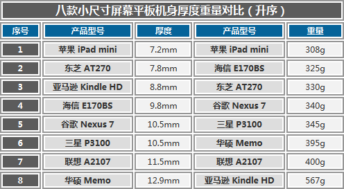 可以被称作全球最具便携性的小尺寸平板电脑,苹果iPad mini平板电脑拥有一骑绝尘的7.2mm机身厚度以及308g的单机重量,不仅刷新了iPad系列平板电脑在这两方面的记录,同时也刷新了平板电脑机身厚度的记录。数据方面,iPad mini比新iPad薄23%,轻53%,厚度与第四代iPod Touch相同。所以当iPad mini真正被放在手掌上时,外观上像缩小版的iPad 2,而在手感方面则像放大版的第五代iPod Touch了。