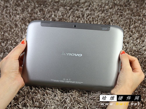 在屏幕的上方为前置130万像素的摄像头,我们注意到,虽然需要严格的控制成本,但联想在前置摄像头方面依然保持了高于双核平板的规格。而屏幕下方为联想的音色Logo设计,十分抢眼。