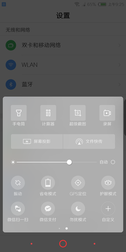 底部上滑可以调出努比亚V18的快捷功能键区域,可以快速开启手电筒、计算器、超级截屏、录屏等功能。WiFi、移动网络、蓝牙、GPS、个人热点、飞行模式、省电模式等都能在这里快速开启/关闭,甚至还有微信扫一扫、微信支付的快速启动键,十分实用。